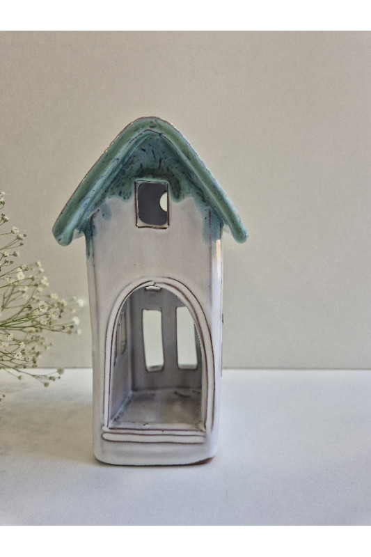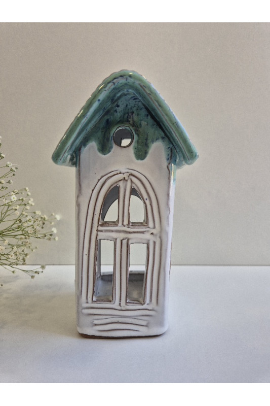 Lampion Domek "Biel z zielenią''. Ręcznie robiona ceramika z Krety, 3040