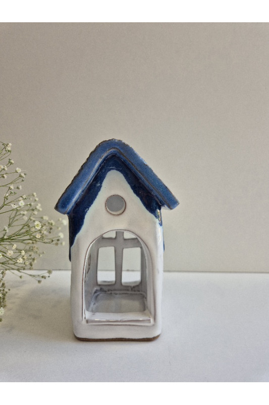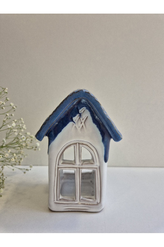 Lampion Domek mały "Biel z niebieskim''. Ręcznie robiona ceramika z Krety 3029