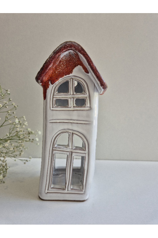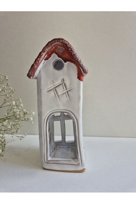 Lampion Domek większy "Biel z czerwienią ''. Ręcznie robiona ceramika z Krety, 3059