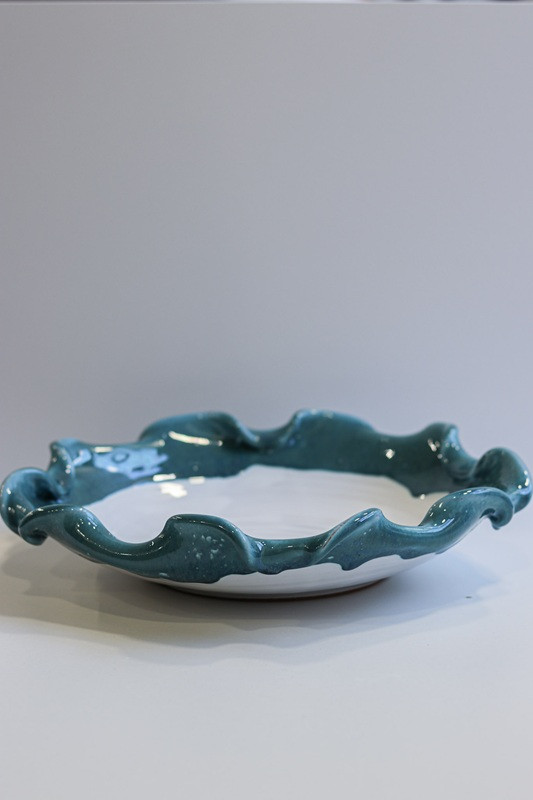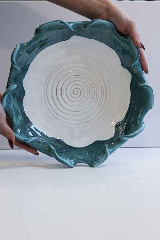 Wyjątkowy, ręcznie robiony talerz z falą na brzegu.