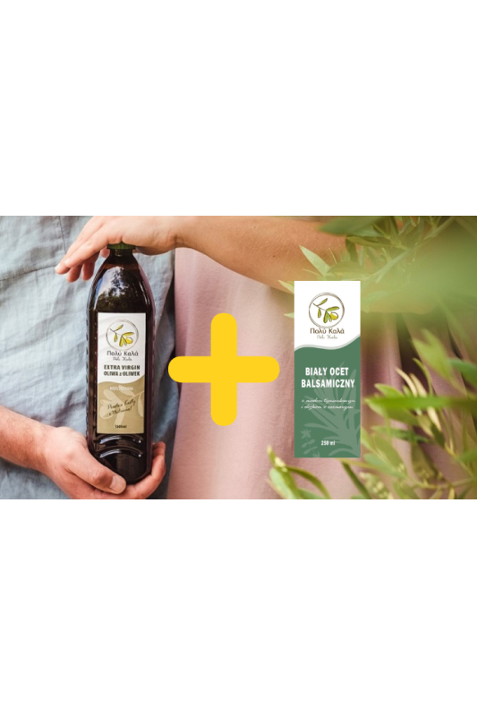 Codzienny „grecki” smak – nasza niefiltrowana Oliwa Extra Virgin Poli Kala o ostrym, charakternym profilu i biały ocet balsamiczny, który dodaje lekkości i nie barwi potraw.